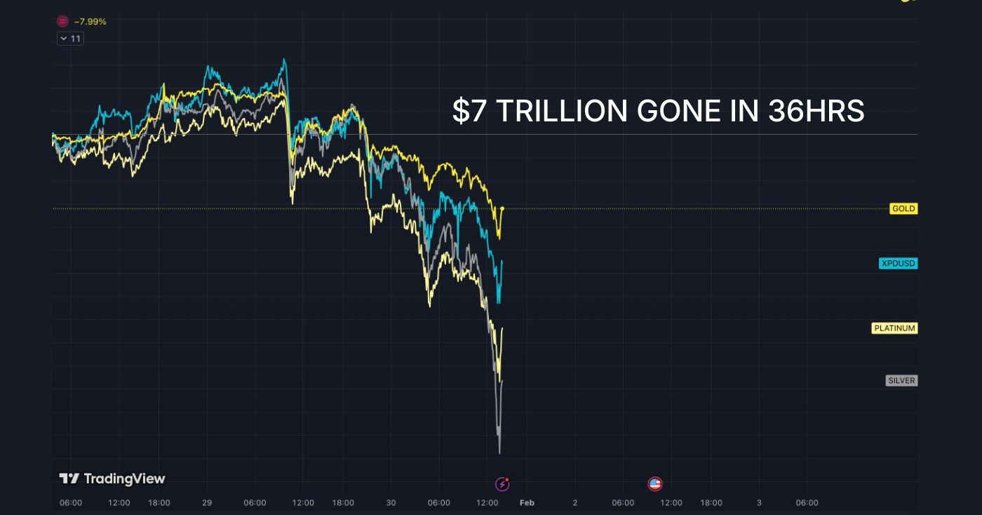 Když více kovů kolabuje spolu touto rychlostí, obvykle to odráží více než jen měnící se fundamenty. Pákový efekt se uvolňuje. Pozice jsou nuceny uzavřít. Riziko se agresivně snižuje, často bez ohledu na cenu. Takové prostředí má tendenci zesilovat volatilitu spíše než ji uklidnit.