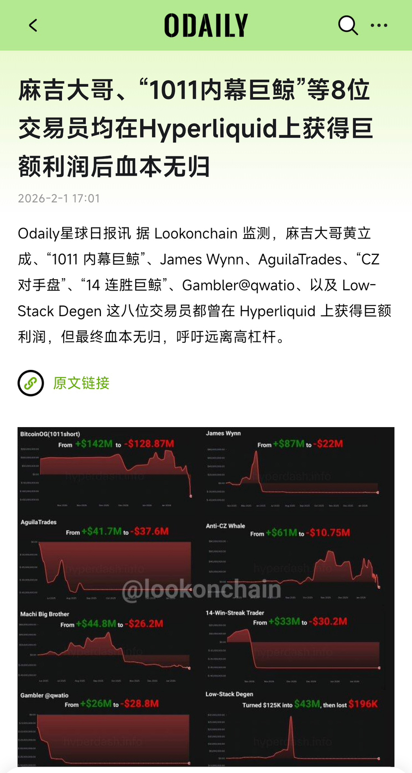 Ranní prudký pokles znovu vyvolal řadu řetězových likvidací. Mnoho velryb a známých obchodníků, kteří se na Hype kdysi těšili slávě, postupně ztratilo vše, včetně: 1011 vnitřní velryby, James Wynn, CZ protivník, Ma Ji Dàgē, AguilaTrades a další; malý Z a Qi Yuan, kteří byli na Binance Square populární, také odchází s obrovskými ztrátami.