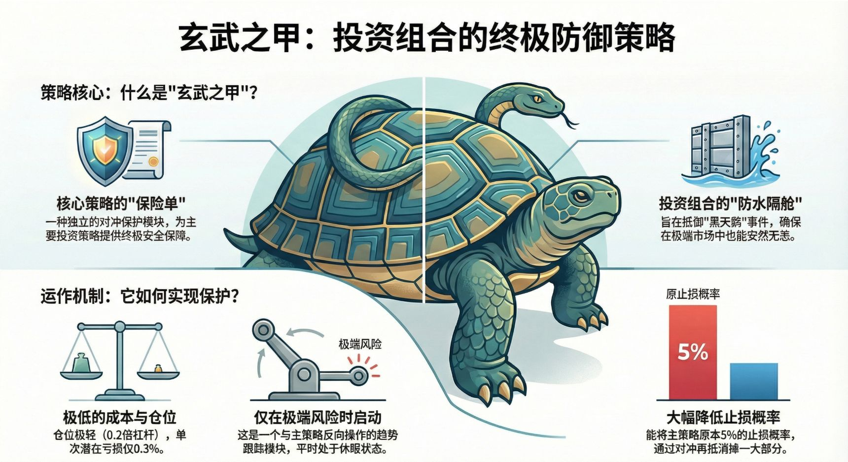 Korytnačí odpočinek (defenzivní obrana): napodobit Xuanwu, usilovat o extrémní stabilitu a přežití. To je obranný základ systému, který hledá vysoce úspěšné „kotvící body“ prostřednictvím matematických vlastností „regrese k průměru“ v intradenních fluktuacích. Cílem není obrovský zisk, ale kontinuální generování stabilního cash flow, jako nikdy se nepotápějící trup lodi.