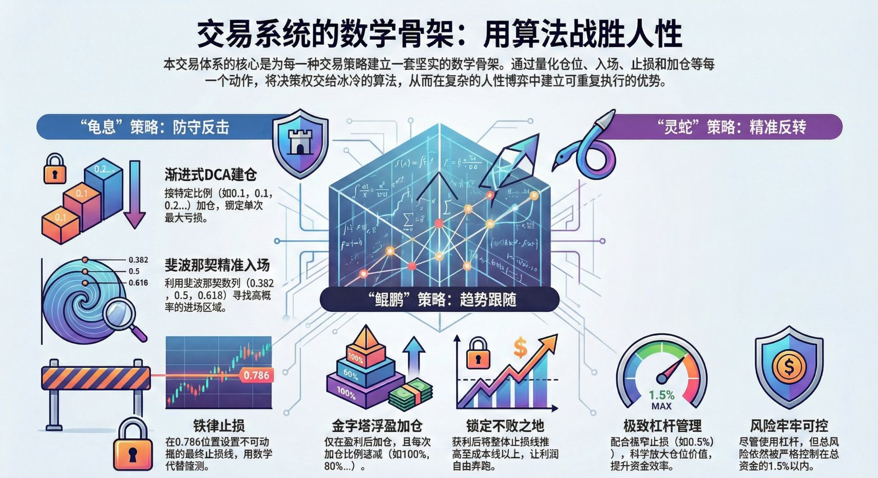 Pokud jde o strategii obratu „duch hada“: používáme extrémní řízení pákového efektu. Protože je stop loss velmi úzký (např. 0.5%), zvyšujeme hodnotu pozice vědecky (např. 3násobný pákový efekt) pro zvýšení efektivity kapitálu, abychom zachytili zisk při malých cenových výkyvech. Riziko je stále pevně kontrolováno v rámci 1.5% celkového kapitálu.