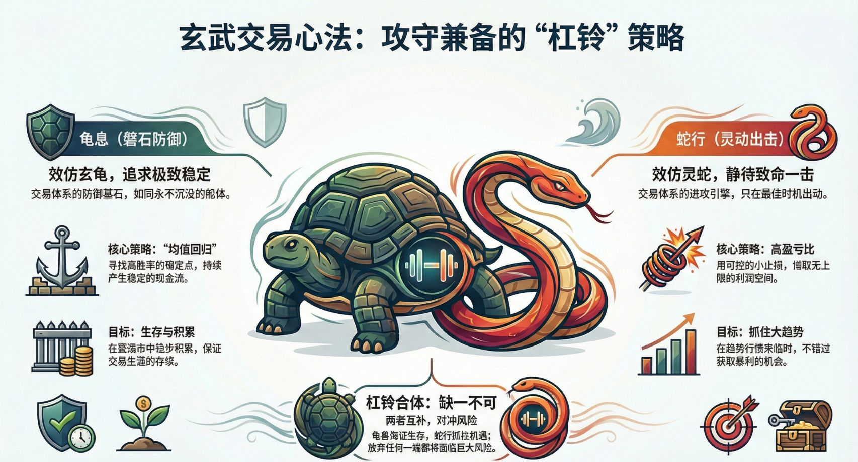 Nejdůležitější je, že tyto dva prvky nejsou na výběr, ale musí existovat současně a vzájemně se doplňovat - „cvičná činka“. Korytnačí odpočinek zajišťuje, že i v turbulentních a nepříznivých podmínkách můžeš stabilně akumulovat a přežít; hadí pohyb zajišťuje, že když přijde velký trend, dokážeš se pevně uchopit a nenechat se shodit z vlaku. Pokud se vzdáš kterékoliv strany, tvá obchodní kariéra bude vystavena nezajištěnému riziku.