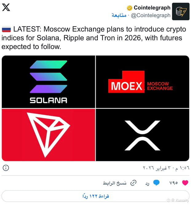 اتخذت أكبر بورصة في روسيا خطوة واضحة نحو تكامل أعمق مع سوق العملات الرقمية. تخطط بورصة موسكو لإطلاق مؤشرات للعملات الرقمية $SOL و $XRP و $TRX في عام 2026. كما تتوقع البورصة طرح منتجات العقود الآجلة بعد فترة قصيرة من إطلاق المؤشرات. تُشير هذه الخطوة إلى تزايد الاهتمام المؤسسي بالأصول الرقمية رغم التعقيدات التنظيمية.