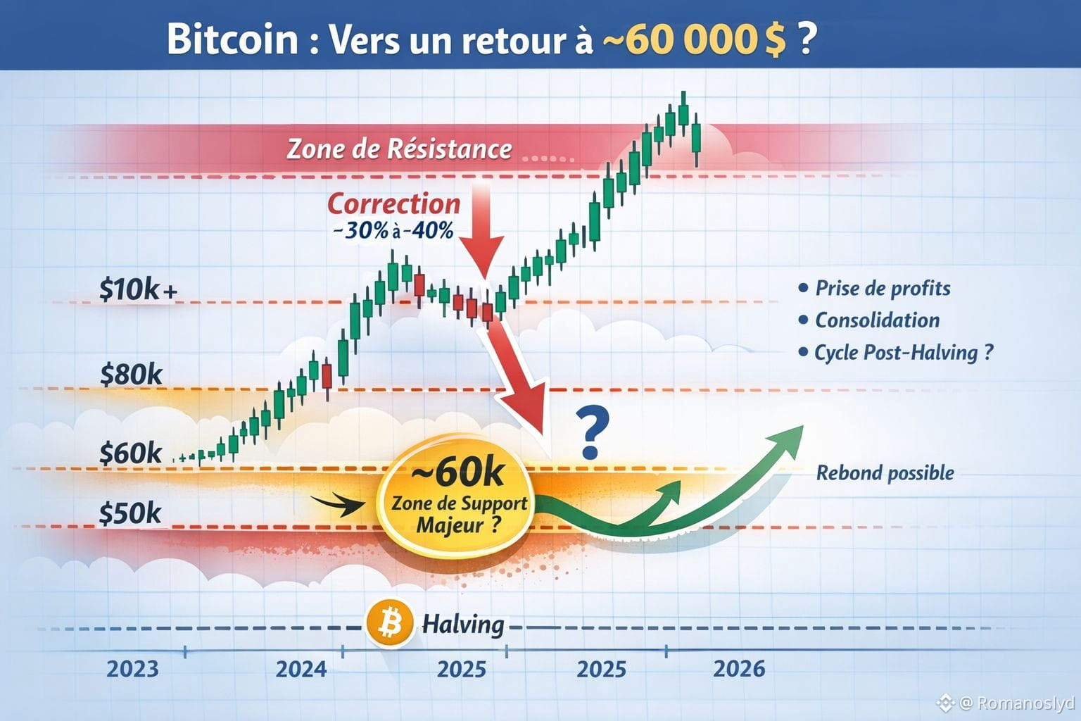 Cette structure cyclique rend plus plausible une zone de rééquilibrage autour de ~60 000 $ même après une forte hausse. �