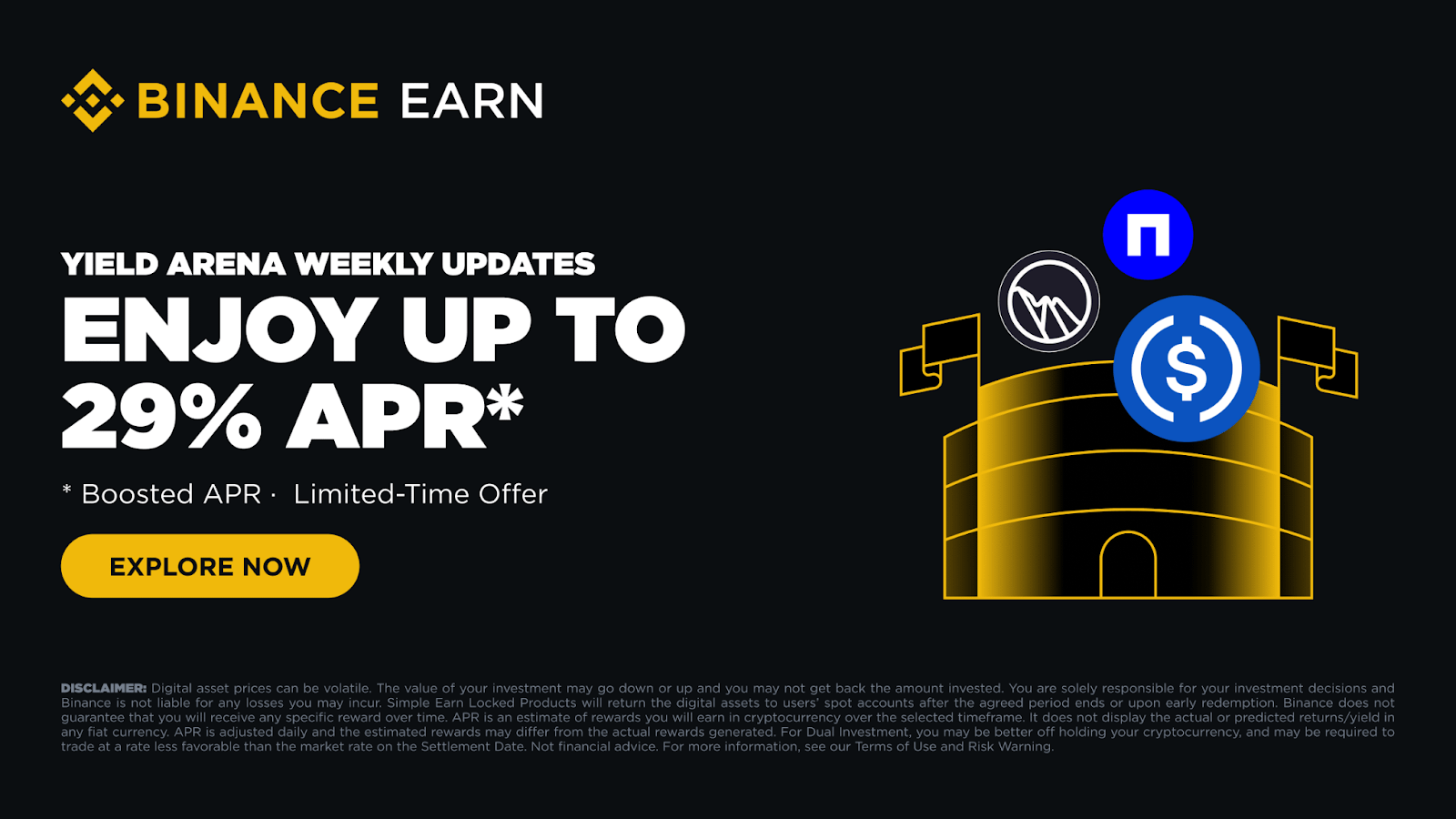 APR odměny jsou distribuovány z vlastních prostředků Binance a jsou určovány na základě hodnocení a vyhodnocení aktuálních tržních podmínek. Tato propagace není nijak spojena s emitentem USDT/USDC.