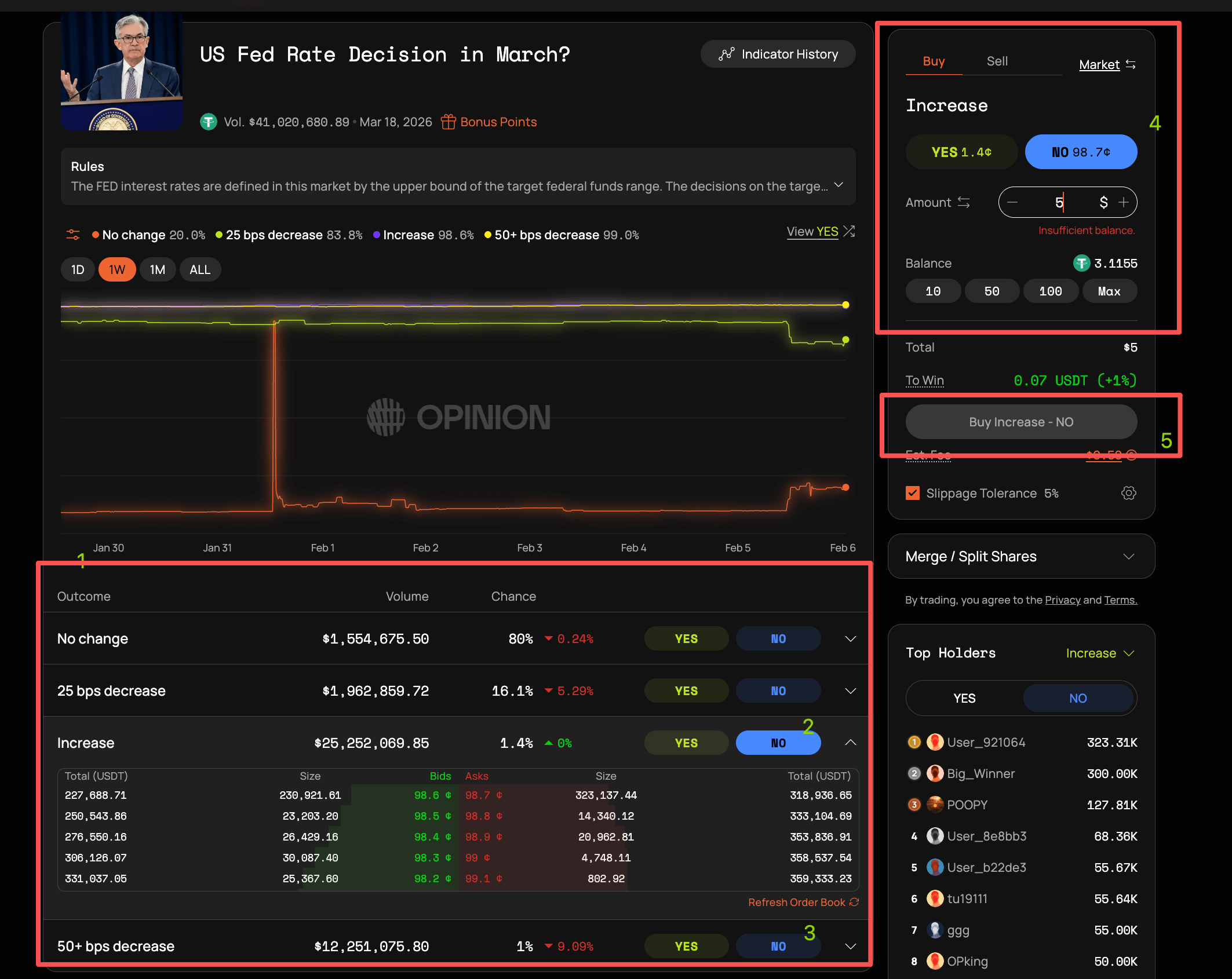 具体的操作,点击左侧 2 、 3 这里的 No 选项,然后在右上交易部分,Amount 里输入 5u ,然后点击 5 处的按钮买入。