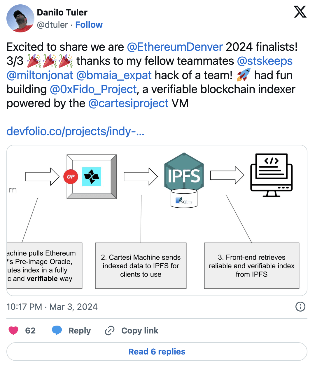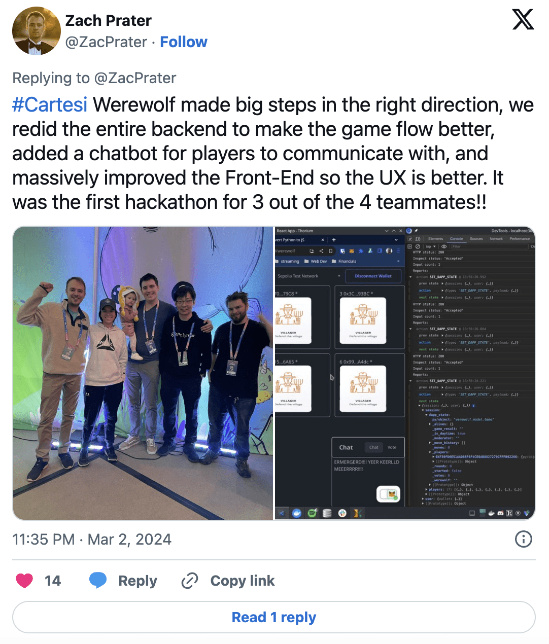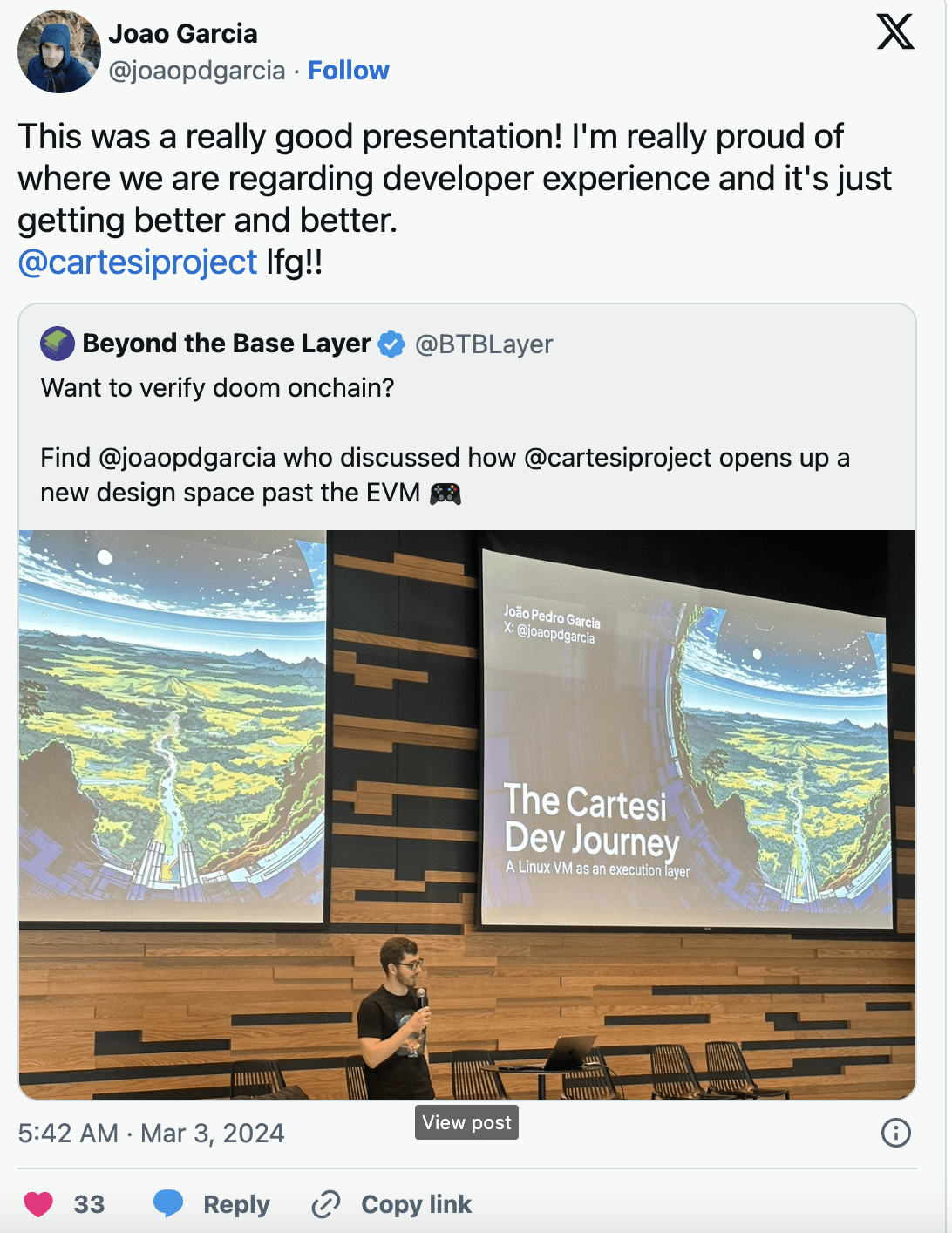 Bleskové rozhovory, ukázky, panelové diskuze a živé debaty s lídry z předních VM projektů, jako jsou Aztec, EigenLayer a Movement Labs, João zastupoval Cartesi v prezentaci zaměřené na vývojovou cestu Cartesi a ve spolupráci s Polygon Miden, RiscZero a Fuel Labs.