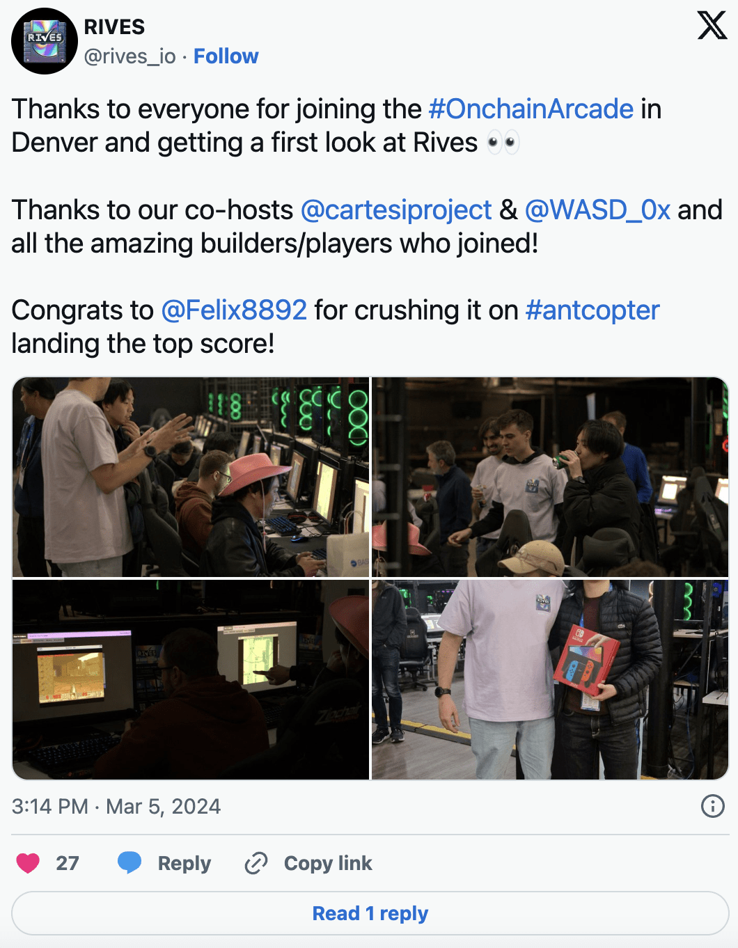 Zároveň bych také rád vyjádřil své zvláštní poděkování všem, kteří se podíleli na on-chain pasáži! Měli jsme to štěstí, že jsme tuto událost pořádali v LocalHost v Denveru, internetové kavárně, která hostí některé z největších esportových turnajů na světě, jako je CSGO a dokonce World of Wild Rift! Měli jsme celé místo pro sebe, pizzu a nápoje připravené. Rádi vidíme lidi hrát herní kazety na Rives.