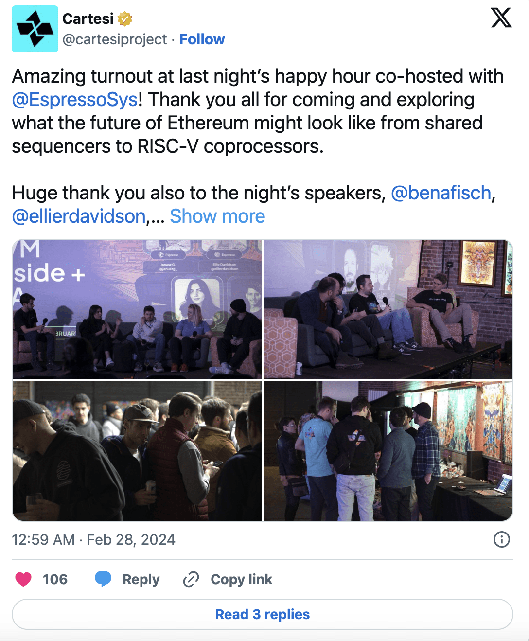 Večer byl plný zasvěcených diskusí o budoucnosti EVM ao tom, jak rozšířit jeho limity. Navíc bylo skvělé vidět, jak všichni drží drinky, baví se a komunikují spolu! Pokud jste to nestihli, zde je malý video dojem z noci.