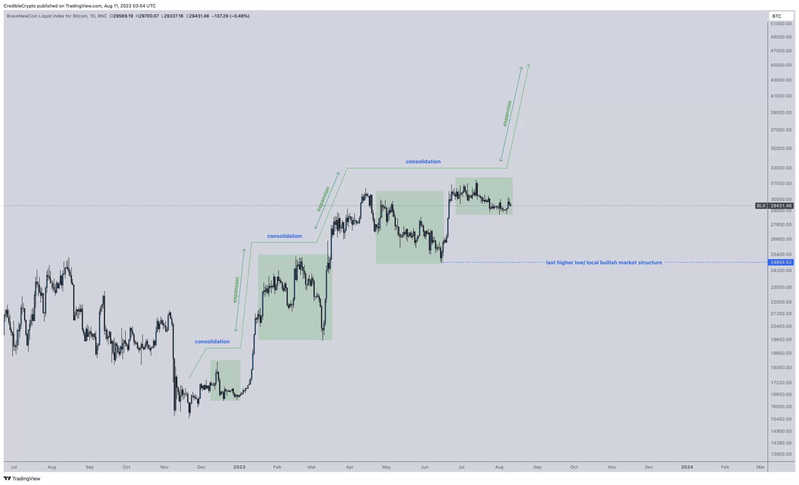 Zatímco mnoho BTC býků ztratilo důvěru kvůli nečekané cenové akci bitcoinu, Credible Crypto říká, že bitcoin se pouze konsoliduje a to by mělo být považováno za býčí.