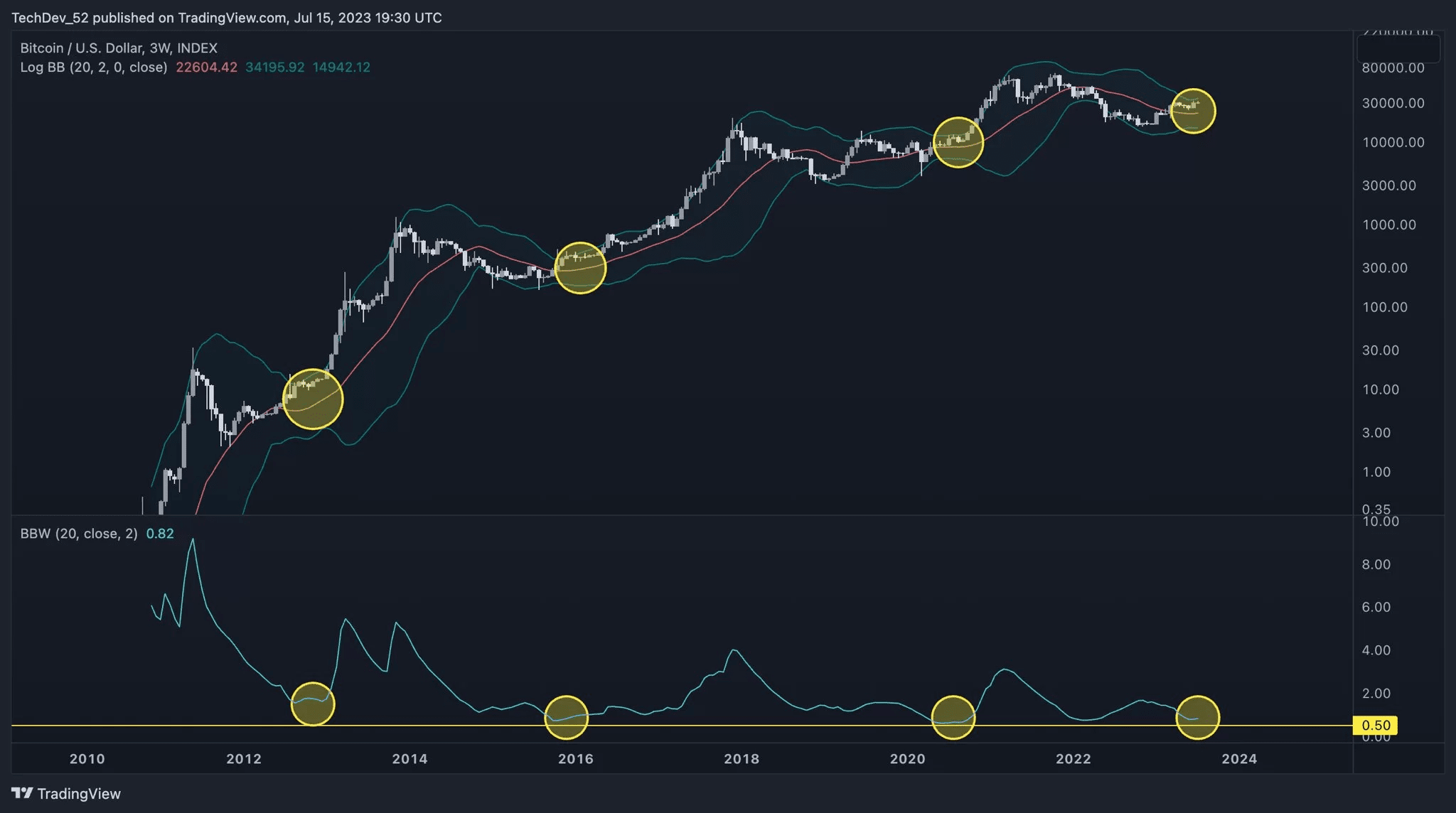 Pseudonymní analytik známý jako Credible Crypto sdělil stovkám tisíc investorů, že BTC přešel z období rekordně nízké volatility do fáze komprese. Ve svém posledním hodnocení trhu Credible poukázal na třítýdenní bitcoinový graf, který citoval z TechDev. Zde vypadají zajímavě úrovně komprese, které znamenaly začátek býčích trhů od roku 2012.