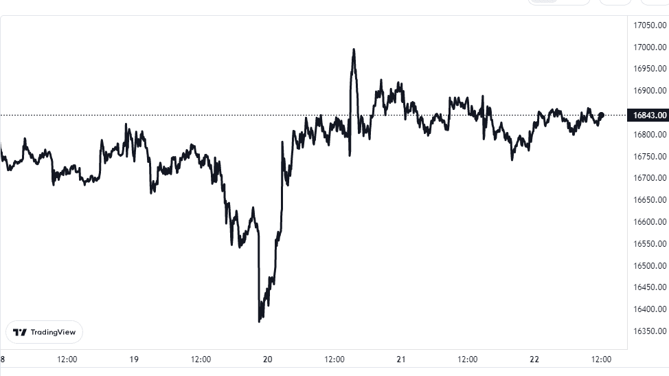 Zum Zeitpunkt des Schreibens liegt der Bitcoin-Preis bei etwa 16.800 $ und ist in der letzten Woche um 5 % gefallen.