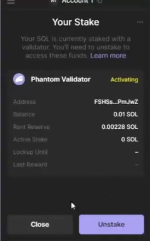 Sie können jederzeit in der Phantom Wallet unstaken, um die Aktivität der Wallet aufrechtzuerhalten.