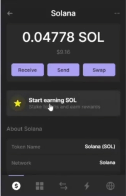 Wählen Sie den SOL-Token in der Wallet aus und klicken Sie auf 'Beginnen Sie, SOL zu verdienen'.