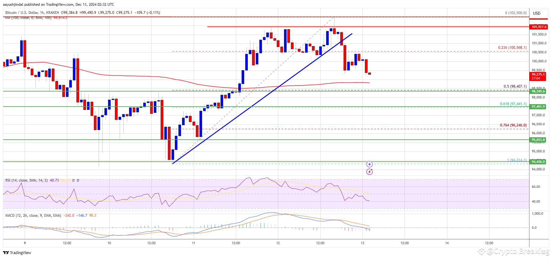 Der Preis hat sogar die Marke von 100.000 $ überschritten, aber die Bären waren in der Nähe der Zone von 102.000 $ aktiv. Ein Hoch wurde bei 102.500 $ gebildet und der Preis konsolidiert jetzt Gewinne. Er bewegt sich langsam unterhalb des 23,6%-Fibonacci-Retracement-Niveaus der letzten Welle vom Tiefststand von 94.315 $ bis zum Hoch von 102.500 $.