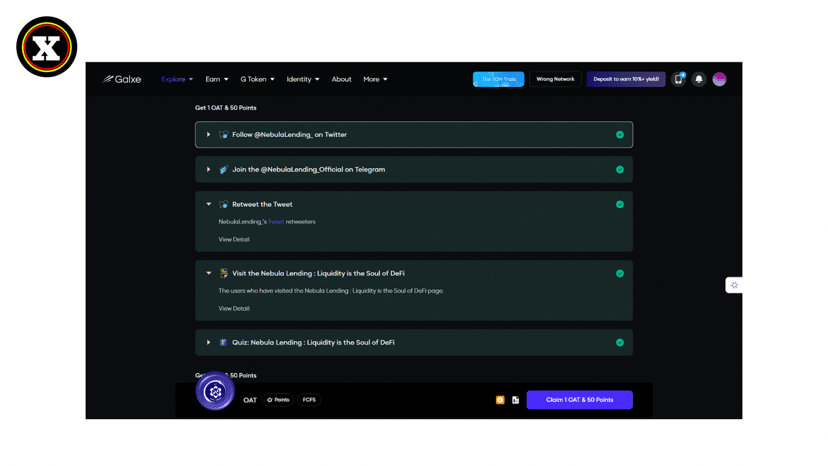 Schließen Sie alle erforderlichen Aufgaben ab, um Ihr OAT (On-Chain Achievement Token) und Punkte zu verdienen.