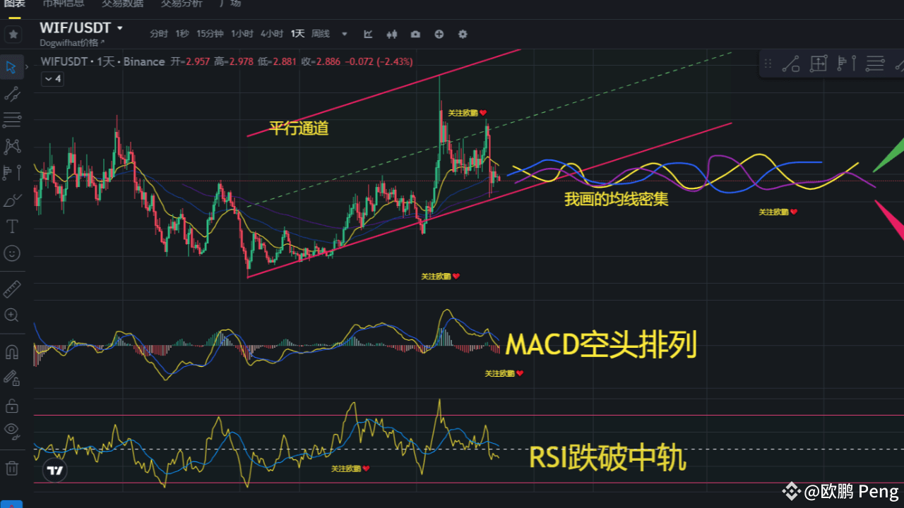 Oben im Bild können wir sehen, dass der aktuelle Preis immer noch im parallelen Trendkanal liegt, unterhalb der Mittellinie. Der Preis hat sich nach einem Rückgang auf die untere Linie des parallelen Kanals wieder erholt und schwankt. Außerdem haben sich die drei gleitenden Durchschnitte auf dem Tageschart bereits verengt. Entsprechend der Richtung der Verengung habe ich die Verlängerungen der drei gleitenden Durchschnitte eingezeichnet. Wir können sehen, dass es zu einer Verdichtung der gleitenden Durchschnitte kommen wird und dann eine neue Richtung erscheinen wird!!! Der MACD unten ist ebenfalls in einem bärischen Arrangement, die roten Momentum-Säulen nehmen allmählich zu, und der RSI ist ebenfalls unter die Mittellinie gefallen, was von der Luftwaffe dominiert wird.