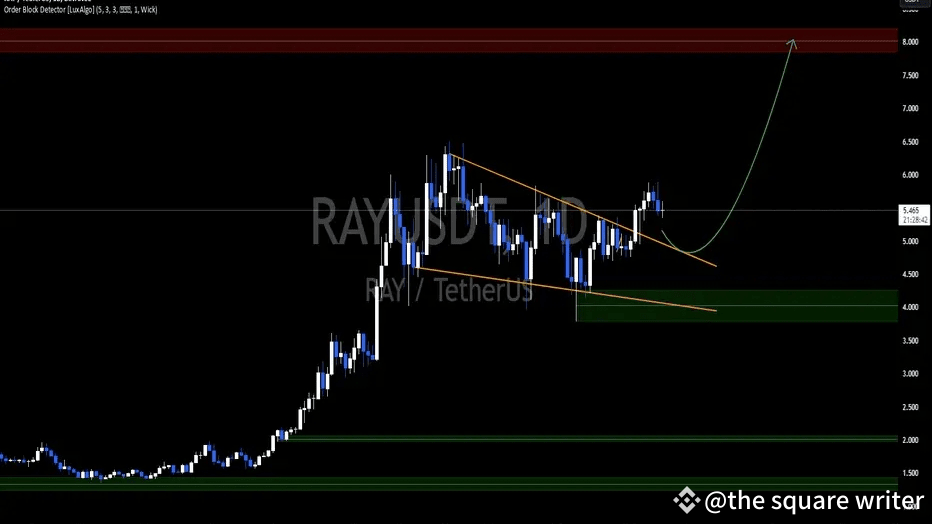 $RAY bereitet sich auf einen potenziell explosiven Move vor. Der Chart zeigt einen Ausbruch aus einem absteigenden Keilmuster, einem klassischen #bullish Umkehrsignal. Die aktuelle Preisbewegung konsolidiert sich um $5,45 und deutet auf weiteres Aufwärtsmomentum hin.