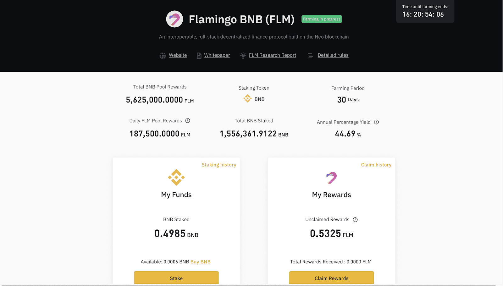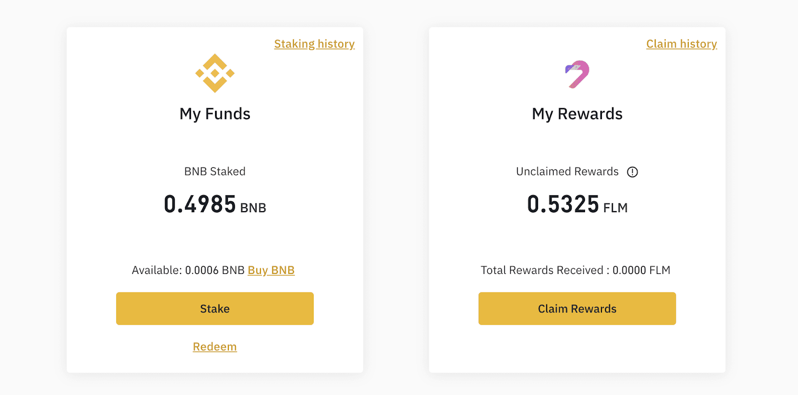 Sie kรถnnen dann auf [Einsatz] klicken, um BNB einzusetzen und FLM zu farmen. Ihre Vermรถgenswerte kรถnnen jederzeit eingelรถst werden, indem Sie auf [Einlรถsen] klicken. Um Ihre Einsatzaufzeichnungen anzuzeigen, klicken Sie auf [Einsatzverlauf].
