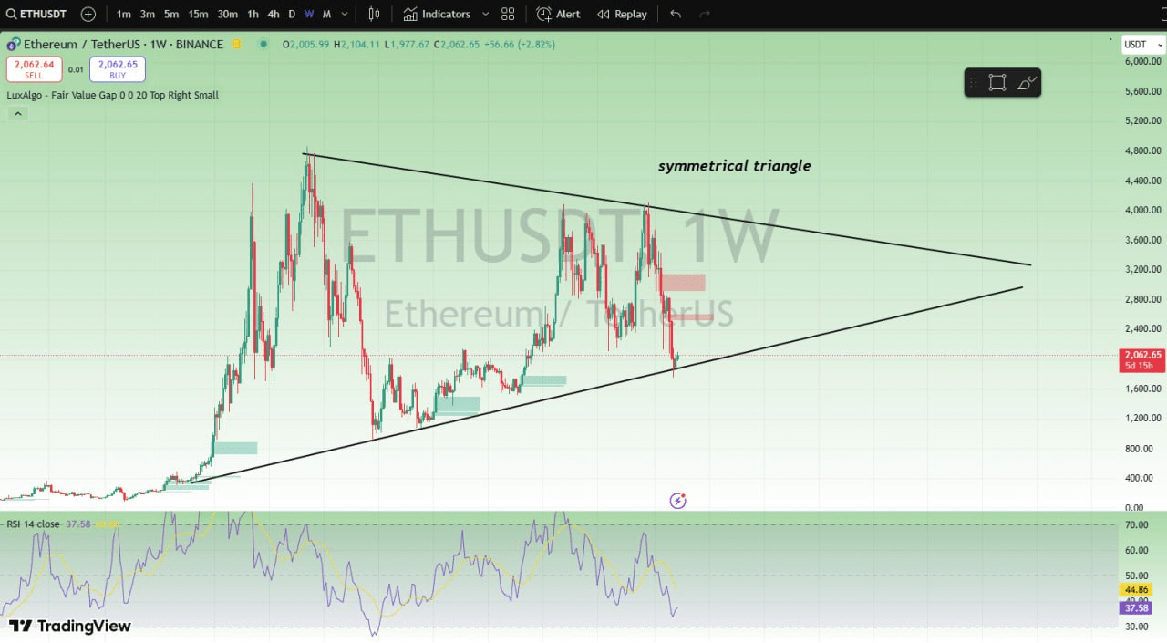 Im wöchentlichen Zeitrahmen bildet ETH ein aufsteigendes Dreieck, ein neutrales Muster. Es hat bereits die untere Unterstützungstrendlinie berührt, was auf eine Aufwärtsbewegung hindeutet. Kurzfristig kann ETH jedoch einige Richtungsänderungen zeigen, aber auf lange Sicht bleibt es bullisch.