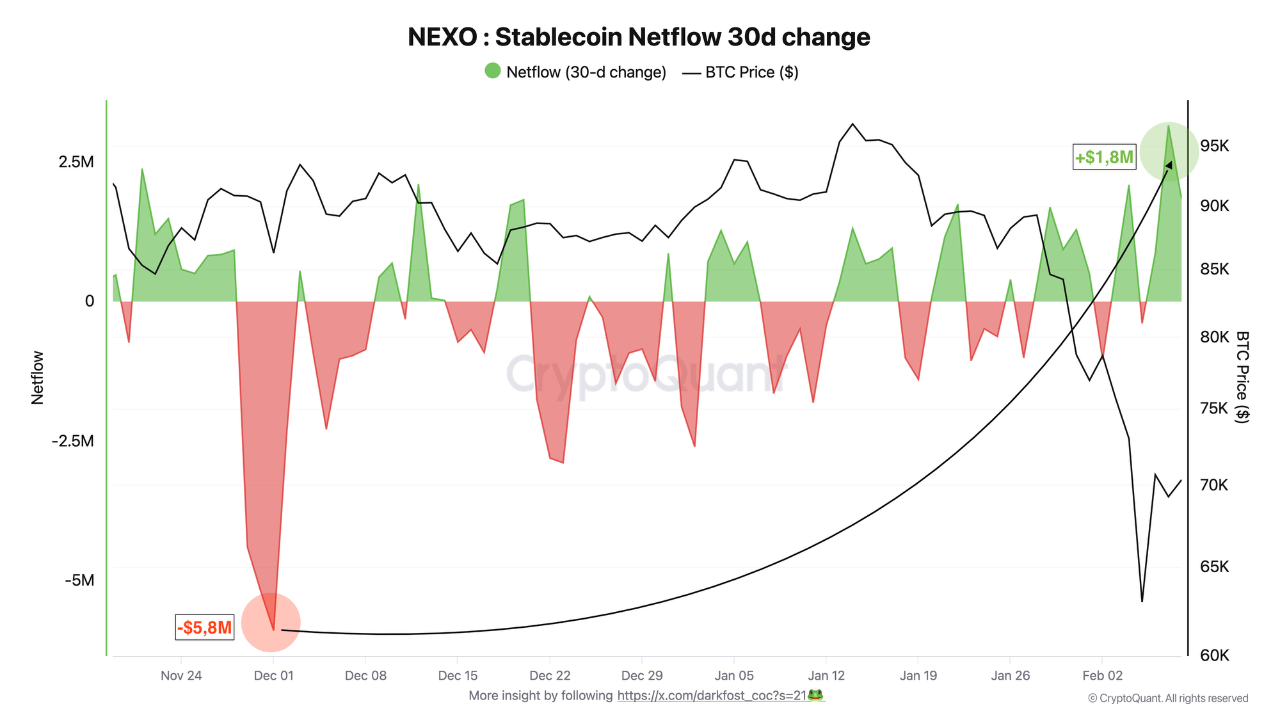 Am 1. Dezember lagen die durchschnittlichen monatlichen Abflüsse von Stablecoins bei etwa -5,8 Millionen US-Dollar, da sich die Korrektur von Bitcoin beschleunigte. Als der Rückgang anhielt, kehrten die Zuflüsse um, und die Nettoströme von Stablecoins auf Nexo wurden positiv und erreichten nun etwa 1,8 Millionen US-Dollar.