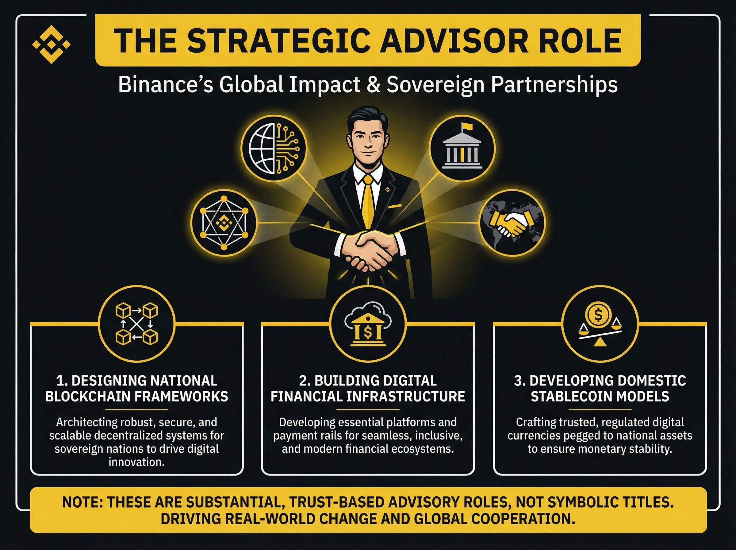 Vielleicht ist das aufschlussreichste Zeichen für die Glaubwürdigkeit von Binance die Rolle seiner Führung. Während sich die Medien auf FUD konzentrieren, haben mehrere souveräne Nationen CZ eingeladen, als strategischer Berater zu fungieren. Diese Rollen beinhalten: