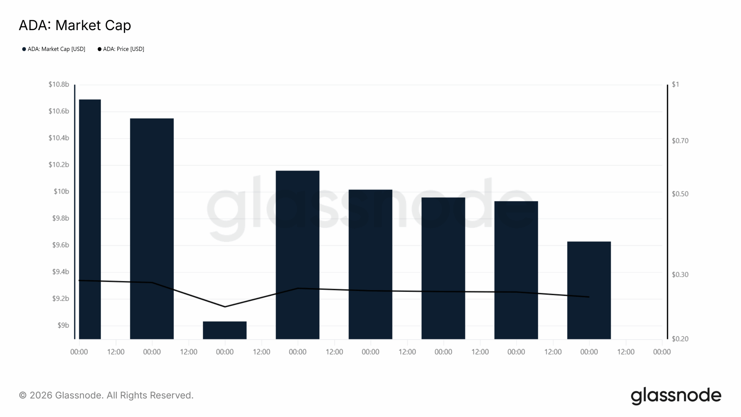 Ein von Glassnode bereitgestellter Chart überwacht die Marktkapitalisierung von ADA sowie den ADA-Preis in USD. Laut diesem Chart ist die Bewertung von ADA stetig gesunken, über die Zeit abnehmend, jedoch nicht abrupt.