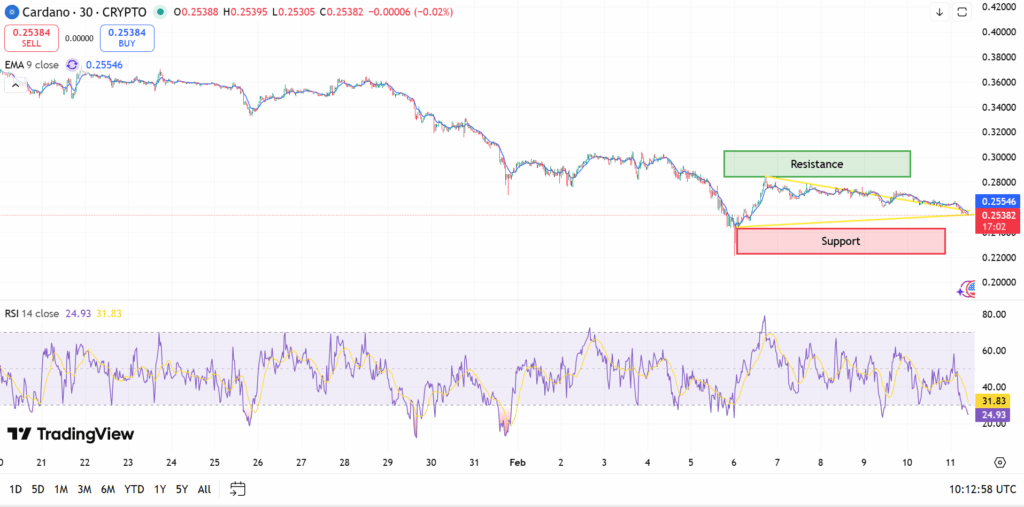 Der aktuelle Preis von Cardano konzentriert sich um die Unterstützungszone von $0,24–$0,25. Laut vergangenen Daten hat dieser Bereich frühere Kaufaktionen dargestellt. Der aktuelle Preis handelt direkt über diesem Punkt.