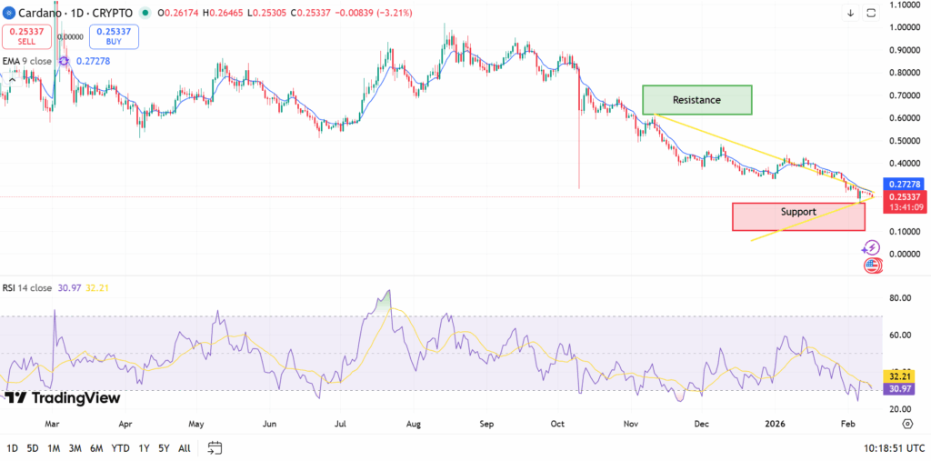 Die breitere Preisprognose für Cardano hängt von der ADA-Reaktion auf den aktuellen Niveaus ab. Falls Käufer die Region von $0,24 verteidigen können und der Preis über den kurzfristigen Widerstand schließt, könnte eine Erholung in Richtung $0,30 stattfinden. Ein Bruch der Unterstützung bei starkem Volumen würde den Abwärtstrend fortsetzen.