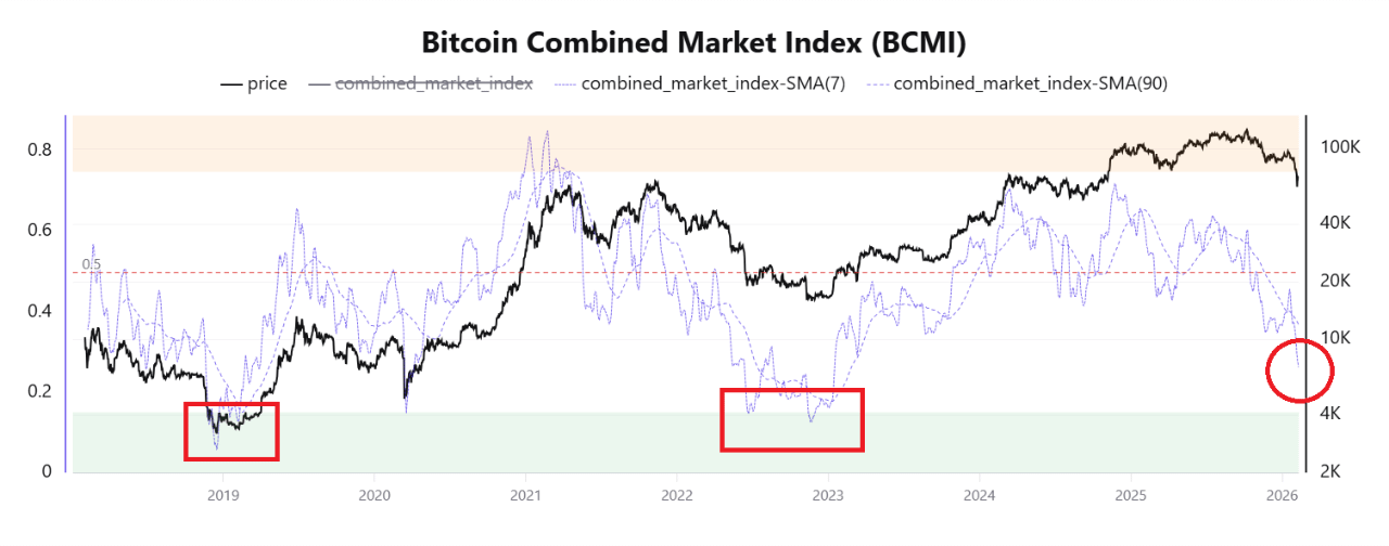 Der kombinierte Marktindex von Bitcoin (BCMI) ist nun in den niedrigen 0,2-Bereich gefallen.
