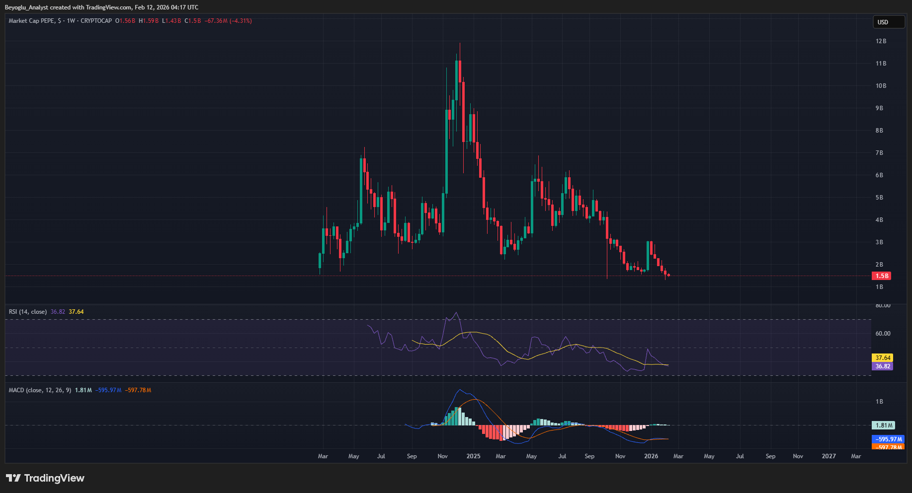 Ähnlich ist die Marktkapitalisierung von PEPE um fast 90 % vom Höchststand von 2024 gefallen.