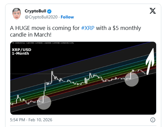 In dem Tweet erklärte CryptoBull: „Eine RIESIGE Bewegung steht für #XRP bevor, mit einer monatlichen Kerze von 5 $ im März“, und verknüpfte die Projektion direkt mit der Struktur, die auf dem höherfristigen Chart sichtbar ist.