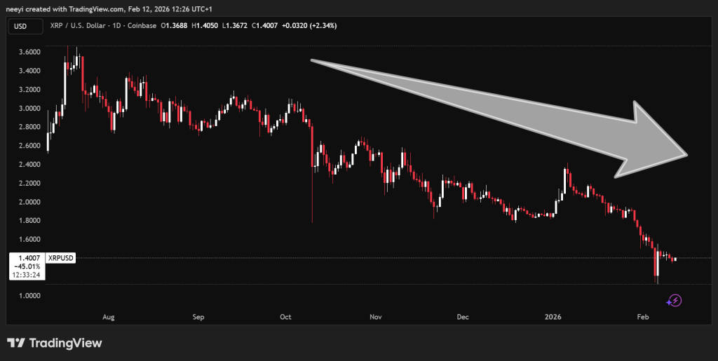 Das dreimonatige Bild sieht noch schwerer aus, mit einem Rückgang von fast 40 % von etwa 2,40 $. Eine solche anhaltende Schwäche wirft die direkte Frage auf, ob Ripples XRP wieder unter die psychologische Marke von 1 $ fallen könnte.