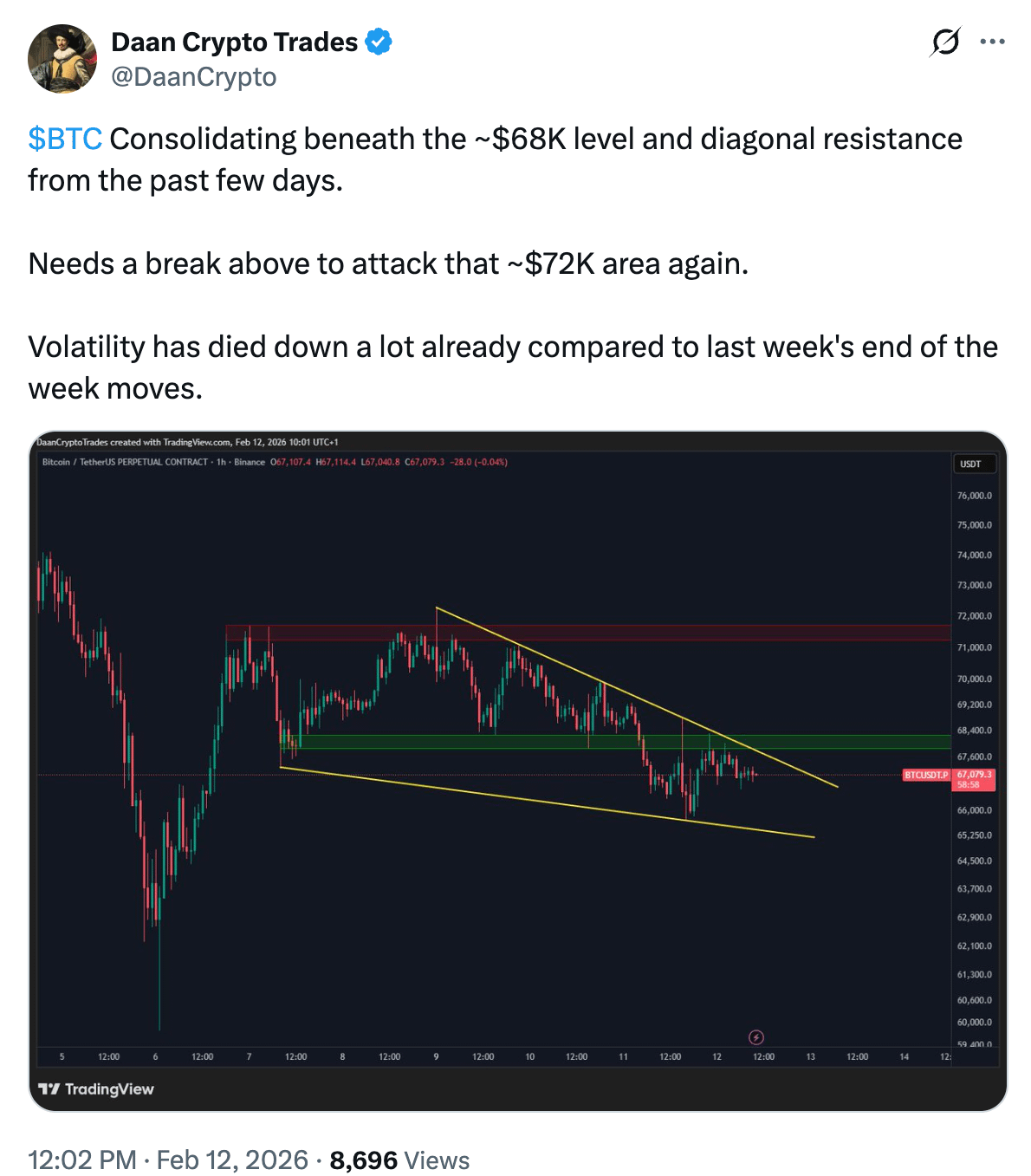 Es konsolidiert sich jetzt innerhalb der kürzlich etablierten Unterstützung unter $65.000 und dem Widerstand bei $68.000, was Analyst Daan Crypto Trades sagte, dass die Bullen „darüber brechen müssen, um $72.000 erneut anzugreifen.“