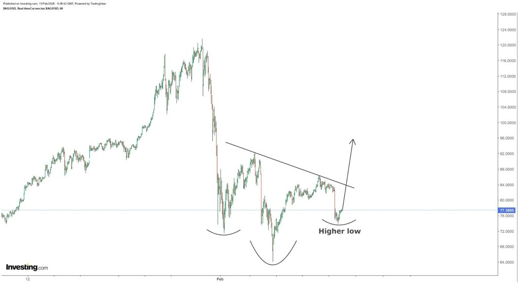 Das klarste auf diesem Chart, das von Rashad Hajiyev geteilt wurde, ist die Veränderung in der Struktur. Nach diesem hässlichen Rückgang aus dem $120-Bereich hat Silber ein tiefes Tief im mittleren $60-Bereich (um $66–$68) gedruckt, sich dann zurückgezogen und begonnen, eine neue Basis zu bilden.