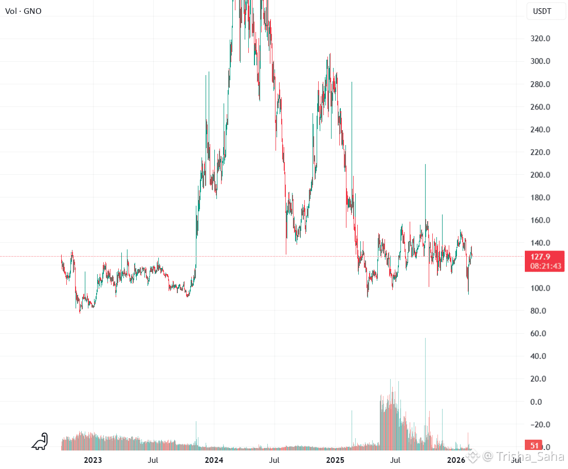 The single most bullish data point on this chart. 0th percentile means there has never been less speculative positioning in GNO's history on this timeframe. Just 136 bars ago, leverage was 298.73x — collapsed from nearly 300x to under 5x. A complete speculative washout.