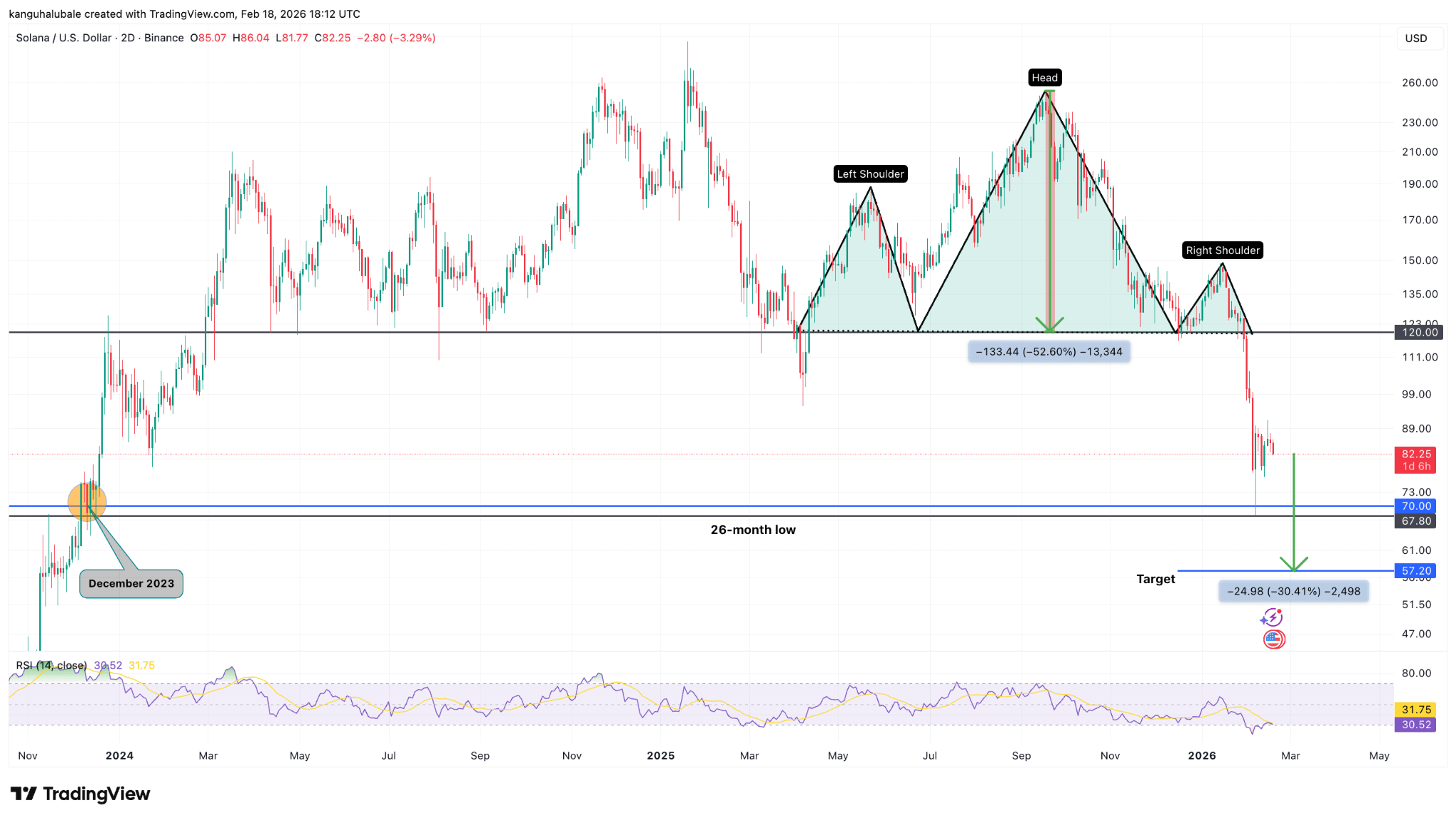 Der Zwei-Tage-Chart zeigt, dass der Preis am 30. Januar unter die Nackenlinie des H&S gebrochen ist, die bei $120 liegt. Das gemessene Ziel des H&S-Musters, berechnet durch Hinzufügen der Höhe des Kopfes vom Ausbruchspunkt, beträgt $57, was einem Rückgang von 30% vom aktuellen Niveau entspricht.
