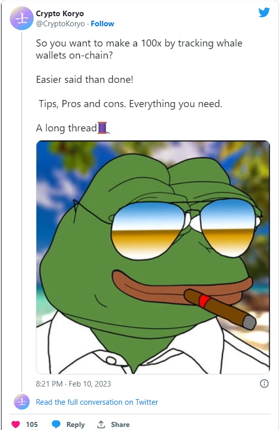 Mithilfe der On-Chain-Analyse können Sie den Geldfluss in der gesamten Kryptowirtschaft verfolgen. Dazu müssen Sie auch kein Wirtschaftsprüfer sein. Konten wie Whale Alert machen Ihnen das Leben einfacher. Hier ist ein guter Beitrag zum Verfolgen von Whale Wallets in der Kette: