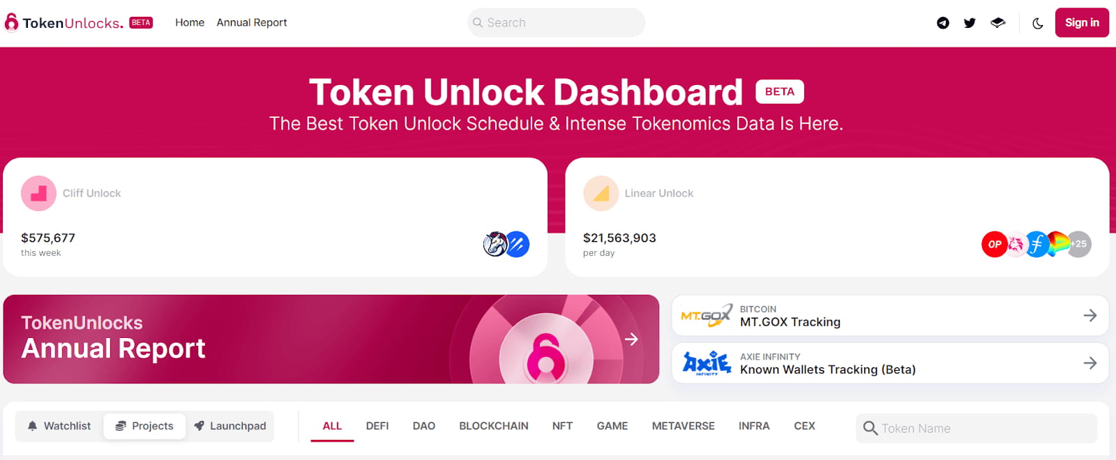 Token Unlock ist ein nützliches kleines Tool zum Verfolgen von Token-Freischaltungen. Es fasst die Token-Ökonomie und die Token-Freischaltpläne verschiedener Projekte zusammen. Dies ist besonders praktisch, um zu beurteilen, ob der Preis eines Tokens im Vergleich zu seinem vollständig verwässerten Wert angemessen ist. Token Unlock veröffentlicht außerdem einen Jahresbericht über das Entsperren von Token.