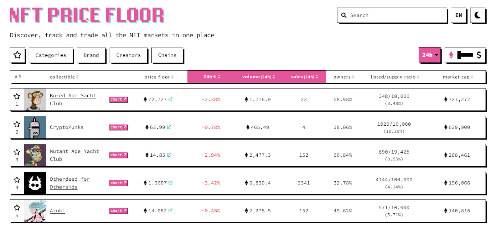 NFT Price Floor ist eine Tracking-Website für NFT-Preisuntergrenzen und andere NFT-Analysen. Als Marktaggregator deckt es alle relevanten NFT-Statistiken, Diagramme und andere NFT-Daten ab. Die Nutzung von NFT Price Floor ist kostenlos.