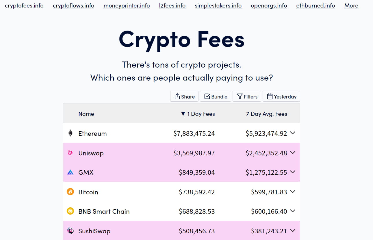 Crypto Fees ist ein weiteres praktisches Tool mit einem einzigen Anwendungsfall. Es zeigt an, wie viele Gebühren das Protokoll und die Blockchain im Laufe des letzten Tages oder der letzten Woche generiert haben. Dies kann dabei helfen, vielversprechende Protokolle zu identifizieren, die tatsächlich Einnahmen generieren und daher tatsächlich angenommen werden. Die Website verlinkt auch auf ähnliche Informationsseiten wie:
