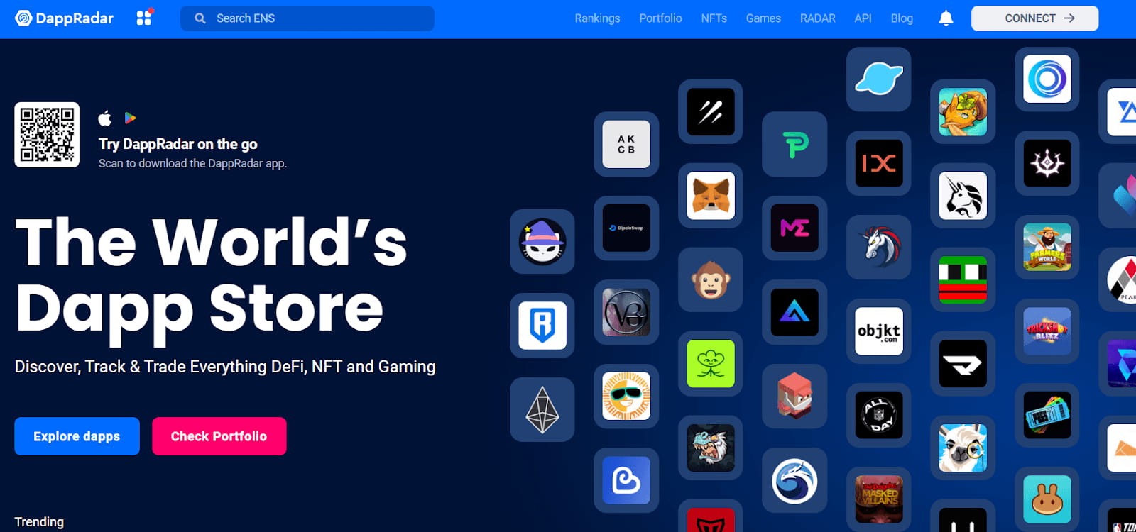 DappRadar ist eine Komplettlösung zur Verfolgung dezentraler Anwendungen, DeFi-Daten, NFTs und mehr. Es bedeckt: