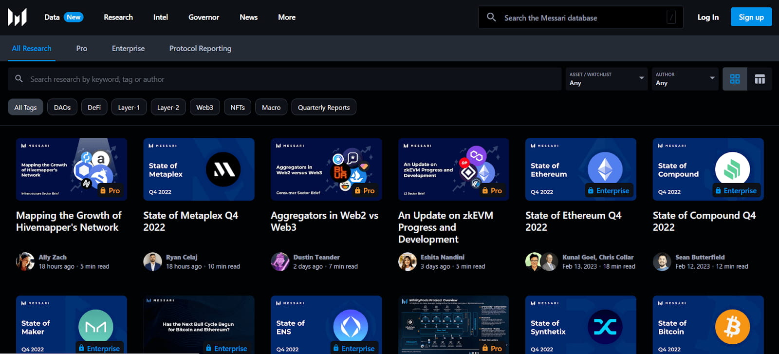 Tonnenweise Forschung: Messari veröffentlicht fast täglich Forschungsberichte zu fast jedem Thema im Kryptoraum, wie DAOs, L1 und L2, Web3, NFTs, Makro und mehr.