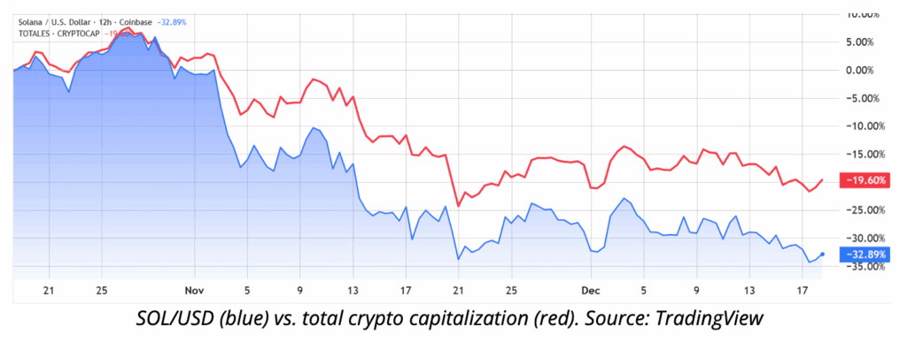Wenn Sie das Gefühl haben, dass etwas im Krypto-Bereich jetzt nicht stimmt, ist das verständlich. Selbst wenn ETF-Starts, institutioneller Kauf und pro-Krypto-Regulierungsbehörden sicherstellen, dass alle Zutaten eines Bullenmarktes vorhanden sind, ist die gesamte Marktkapitalisierung um 32 % von den Höchstständen im Oktober gefallen.