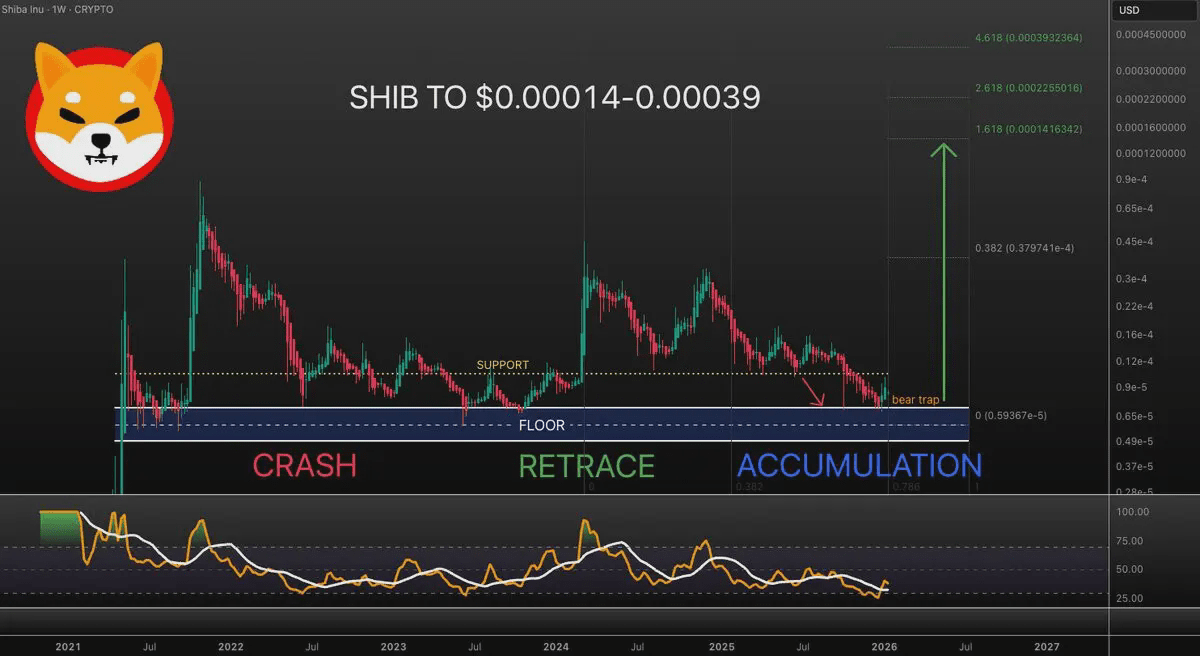 Obwohl Shiba Inu einer der besten Performer im vorherigen Zyklus war, scheint es seit Beginn von 2026 stagnierend zu sein. Der Preis von SHIB hat eine Akkumulationsphase begonnen, nachdem er die Abwärtstrends berührt hat, was bedeutet, dass er nicht mehr so vielen Verkaufsdruck ausgesetzt ist, obwohl es auch an Schwung mangelt. Der nächste große Schritt für Shiba Inu könnte im Jahr 2026 erlebt werden, mit Zielstufen von 0,00014 $ bis 0,00039 $. Obwohl es einige spekulative Verwendung für SHIB gibt, scheint Mutuum Finance für Investoren, die nach nützlichem Wert mit hohem Wachstumspotenzial suchen, attraktiver zu sein.