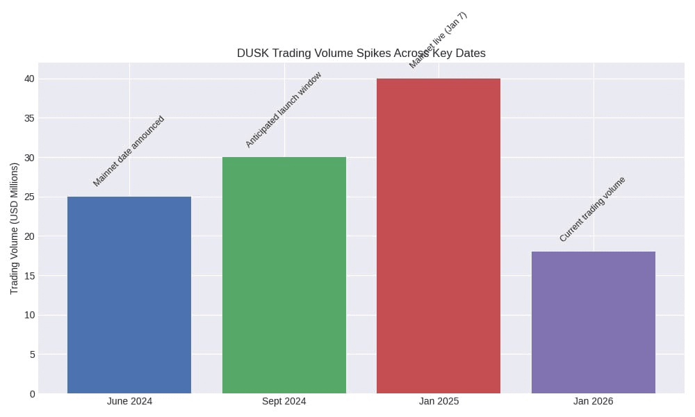 Aus Marktperspektive bleibt DUSK ein relativ kleines Asset im Vergleich zu großen Layer 1s, was das klassische hochvolatile Profil schafft, das Händler erwarten. Mitte Januar 2026 wird DUSK bei etwa 0,17 USD gehandelt, mit Marktkapitalisierungs schätzungen von etwa 80 Mio. USD bis 86 Mio. USD, je nach Quelle und Zeitpunkt, und einer zirkulierenden Menge von etwa 487 Mio. mit einer maximalen Menge von 1 Mrd. Auch Volumenspitzen waren bemerkenswert, was bedeutet, dass DUSK schnell "handelbar" werden kann, wenn die Aufmerksamkeit zurückkehrt.