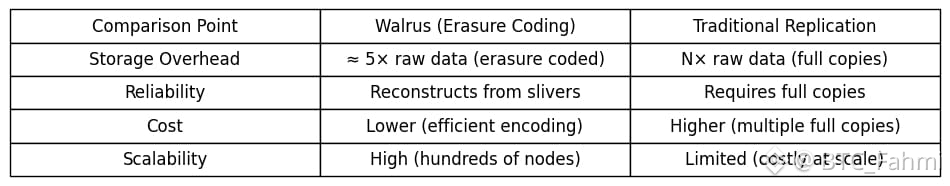 The data plane is where the interesting engineering lives. Walrus doesn’t store full copies of files across nodes (full replication), because replication gets expensive fast. Instead, it uses erasure coding a blob is encoded into many smaller redundant pieces called “slivers,” and these slivers are distributed across a committee of storage nodes. So the network can lose some pieces and still reconstruct the original blob. Walrus’ documentation describes this as a cost efficient approach where the storage overhead is roughly about 5× the raw data size, trading some redundancy for reliability without the extreme cost of copying everything everywhere.