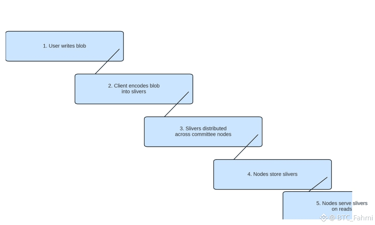 Walrus runs in epochs. Committees are selected for an epoch, and each committee is responsible for storing slivers for blobs. Storage nodes hold slivers from many blobs, not entire blobs. When a user writes a blob, the client coordinates with the active committee to encode the blob into slivers and distribute them. The blog describing how blob storage works emphasizes that the client orchestrates writing, while nodes store the slivers and later serve them on reads.