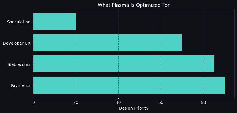 Plasma Layer-1-Blockchain ist mit einem dünnen Umfang konzipiert: Es soll sich wie normale Geldbewegungen anfühlen, indem Stablecoin-Zahlungen ermöglicht werden. Anstatt zu versuchen, eine Alleskönner-Chain zu sein, basiert es auf der Tatsache, dass eine der praktischsten Anwendungen von Krypto Stablecoins sind, die eine der höchsten Anwendungsvolumina haben. Plasma gewährleistet vollständige EVM-Kompatibilität, um Teams die Entwicklung mit vertrauten Ethereum-Tools zu ermöglichen, bietet jedoch zusätzliche zahlungsnative Funktionen, die darauf abzielen, die größten Hemmnisse für die Akzeptanz zu beseitigen, nämlich Gas-Token-Reibung, uneinheitliche Gebührenerfahrungen und dass der Großteil des nicht produzierenden Zahlungskontexts sensibler Geschäftskontext ist.