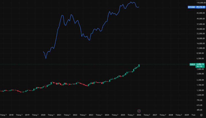 • Gold hat ein ziemlich stabiles Wachstum, aber es ist viel langsamer als Krypto-Assets. Im Durchschnitt steigt Gold in den letzten Jahrzehnten um etwa 7 - 8 % pro Jahr. Der Grund, warum Gold in letzter Zeit so heiß ist, liegt darin, dass Gold seit dem letzten Tiefpunkt (Ende 2025 bis Anfang 2026) um etwa ~146 % gestiegen ist.