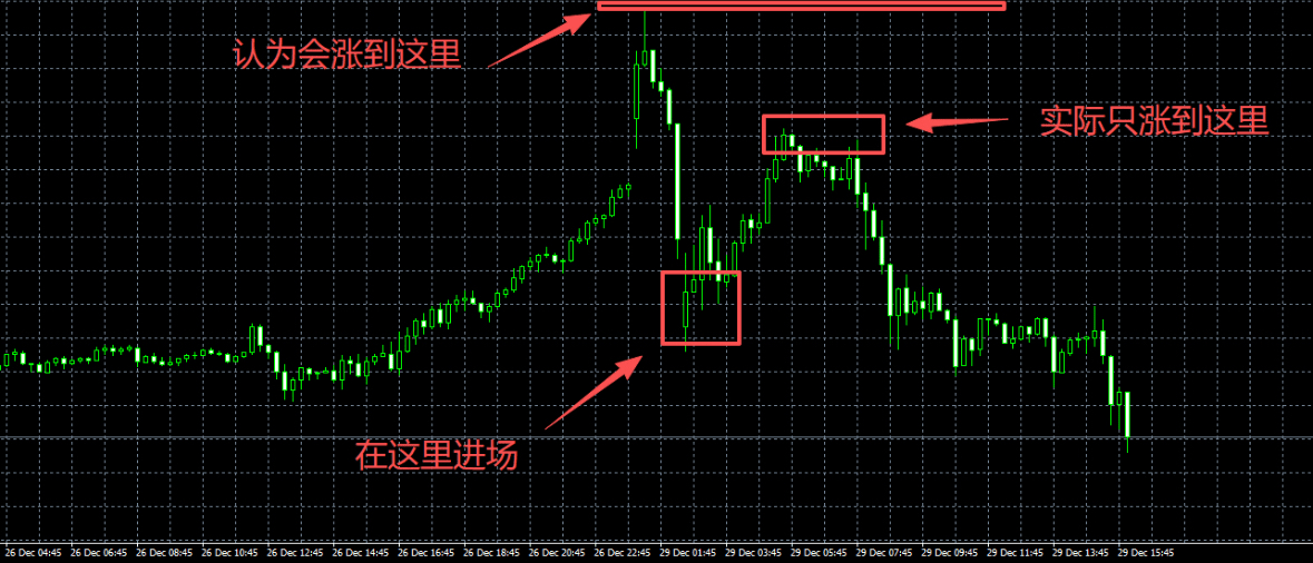 Selbst wenn wir unseren idealen Take-Profit festgelegt haben, muss der Markt bis zu diesem Punkt kommen, wie im folgenden Bild, die vorgestellten und die tatsächlichen Marktbewegungen.